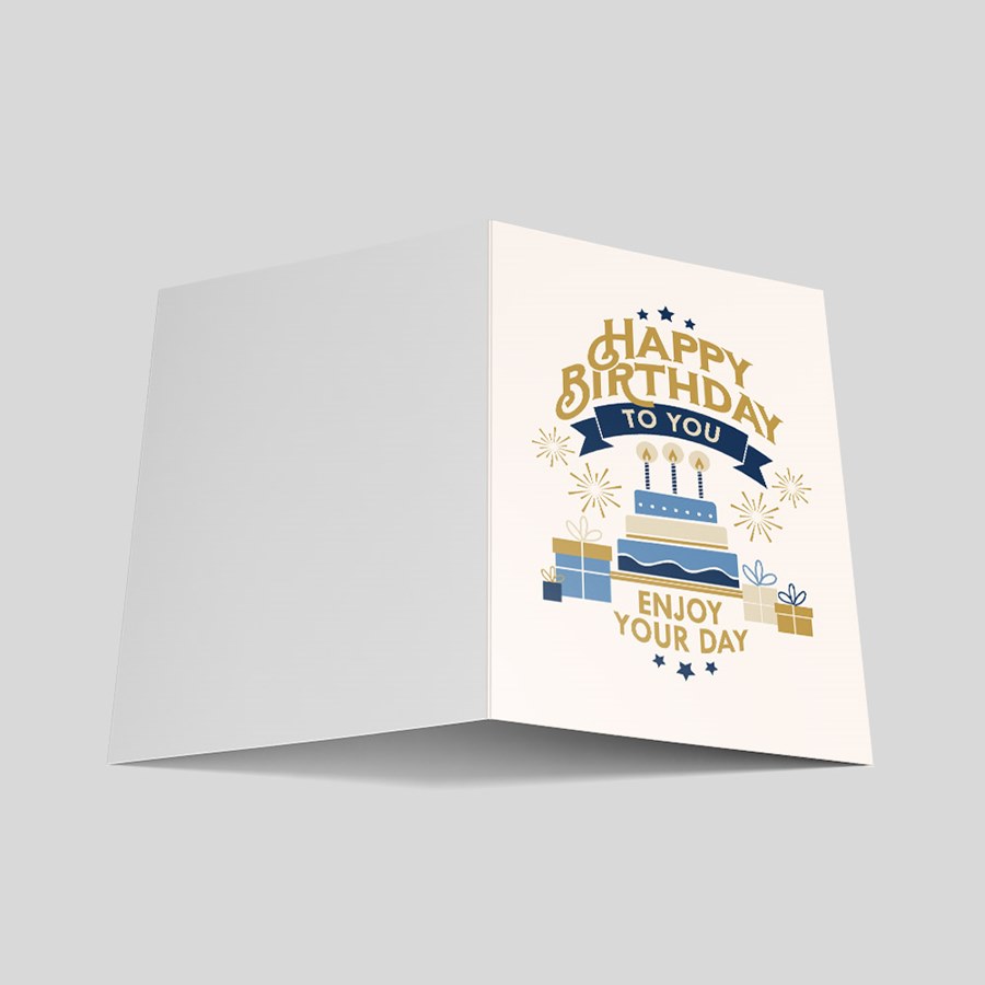 Thoughtfully designed for professional and personal greetings, this card shows a layered cake with three candles framed by gift boxes, decorative stars and sparkles, and the cheerful headline 'HAPPY BIRTHDAY TO YOU' above a friendly 'ENJOY YOUR DAY' footer. A stylized navy wordmark and a refined gold-leaf decorative element add visual contrast on a clean white background, while the interior presents a printed 'Wishing' message in gray with printed signatures for a polished finish. The balanced composition delivers a confident, warm message—ideal when you want a tasteful, corporate-appropriate expression of celebration.
