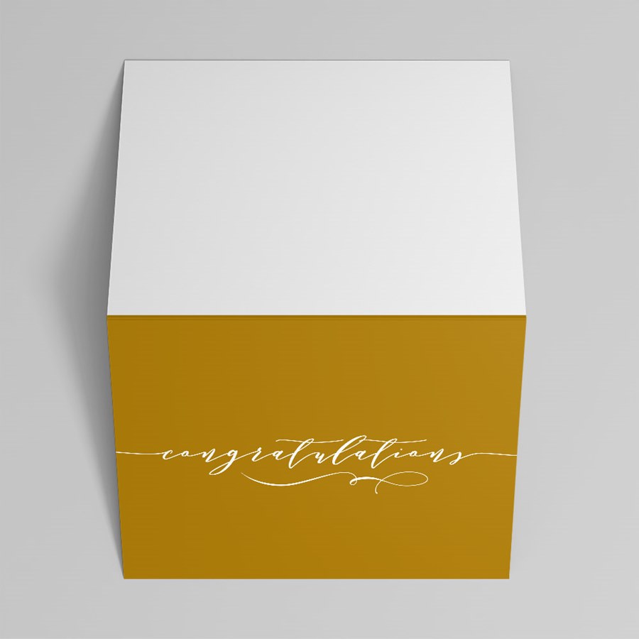 - Elegant front — the word "congratulations" appears in flowing white script with decorative swirls on a rich mustard/golden-yellow field for a refined, professional look.