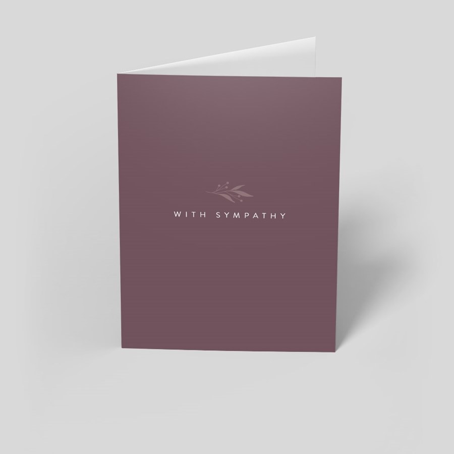 - Quiet, respectful design — a folded card with a deep burgundy to muted purple front and the words WITH SYMPATHY centered in a clean, modern font for a dignified expression of condolence.